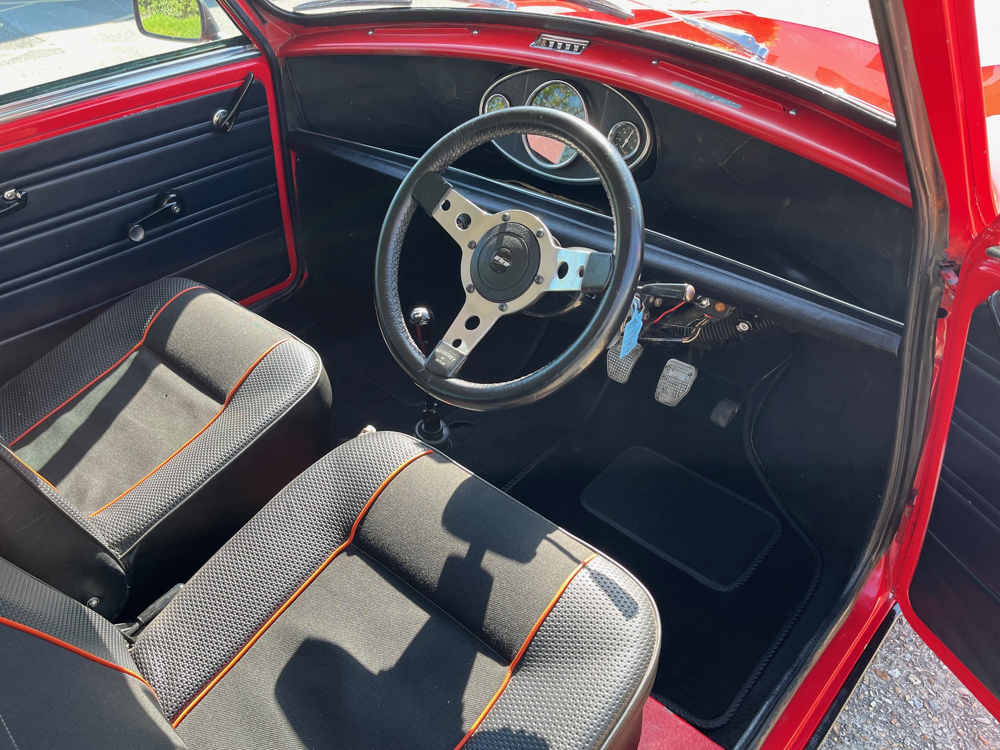 The interior is well presented and purposeful. It has later Italian Job Limited edition seats and the all important three clock centre binnacle and its correct early switch panel with that very period screen wash pump. It also has a Mota-Lita steering wheel and its original roof liner and door cards. What else do you need?