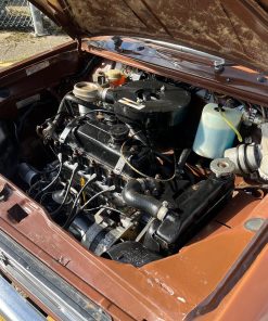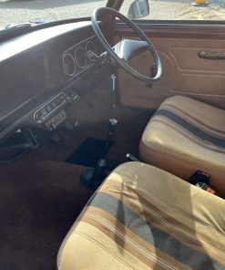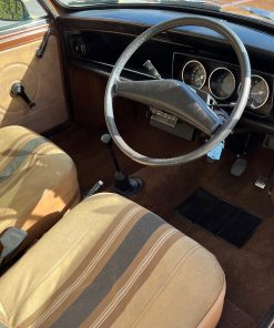 The interior is total seventies, stripey trim, original brown carpets and roof liner. It has the three clock binnacle with the all important 120 MPH speedo which indicates its intentions given the chance and the original Boomerang steering wheel. Simple and effective.