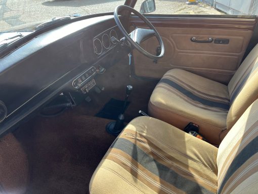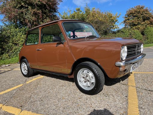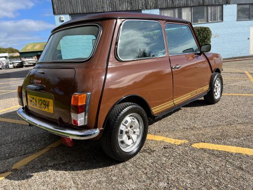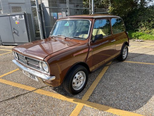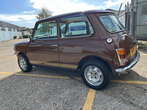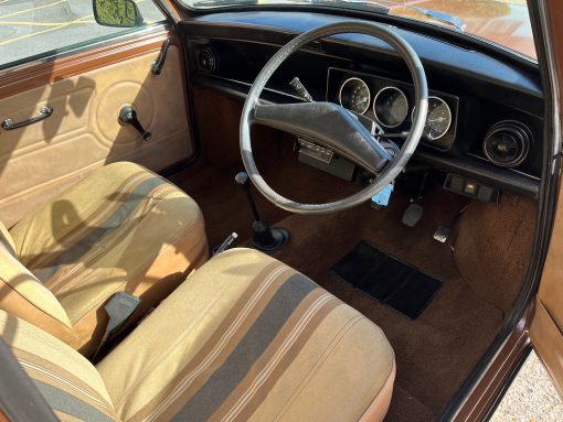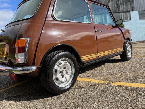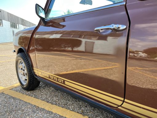 We are very pleased to offer a rare and iconic 1980 Austin Mini 1275 GT. These drivers cars have reached a high status amongst not just classic Mini enthusiasts but across the Classic Car scene and rightly so. GT’s are excellent fun to drive and they offer a real slice of Seventies motoring whilst being very useable at the same time. We have taken this GT in part exchange and it is offered as jump in and drive Mini with room for improvement. Finished in, what in my opinion, is the best colour ever for a Mini, Russet brown with contrasting gold coach lines and stripey trim. It still has its original wheel trims and wider profile tyres.