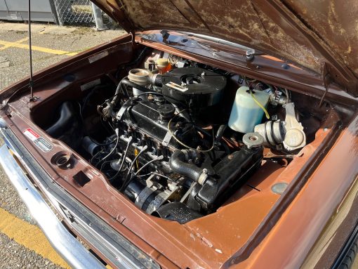 The interior is total seventies, stripey trim, original brown carpets and roof liner. It has the three clock binnacle with the all important 120 MPH speedo which indicates its intentions given the chance and the original Boomerang steering wheel. Simple and effective.