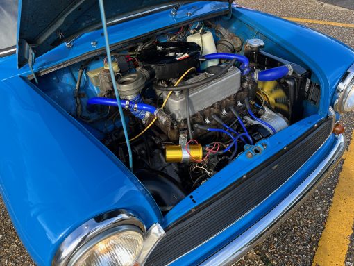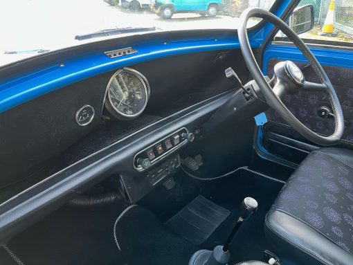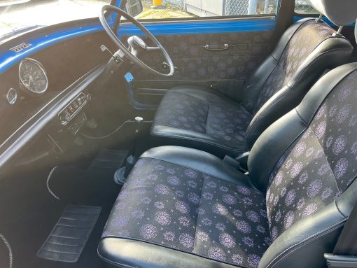 The interior is well presented and has been updated with a full Mini Equinox half leather interior offering more comfort on longer drives. It has matching door cards and very useful rear seat belts. The original roof lining is in very good condition and the all important single centre clock and large steering wheel is present and correct. It also benefits from an auxiliary temperature gauge and a double USB socket.