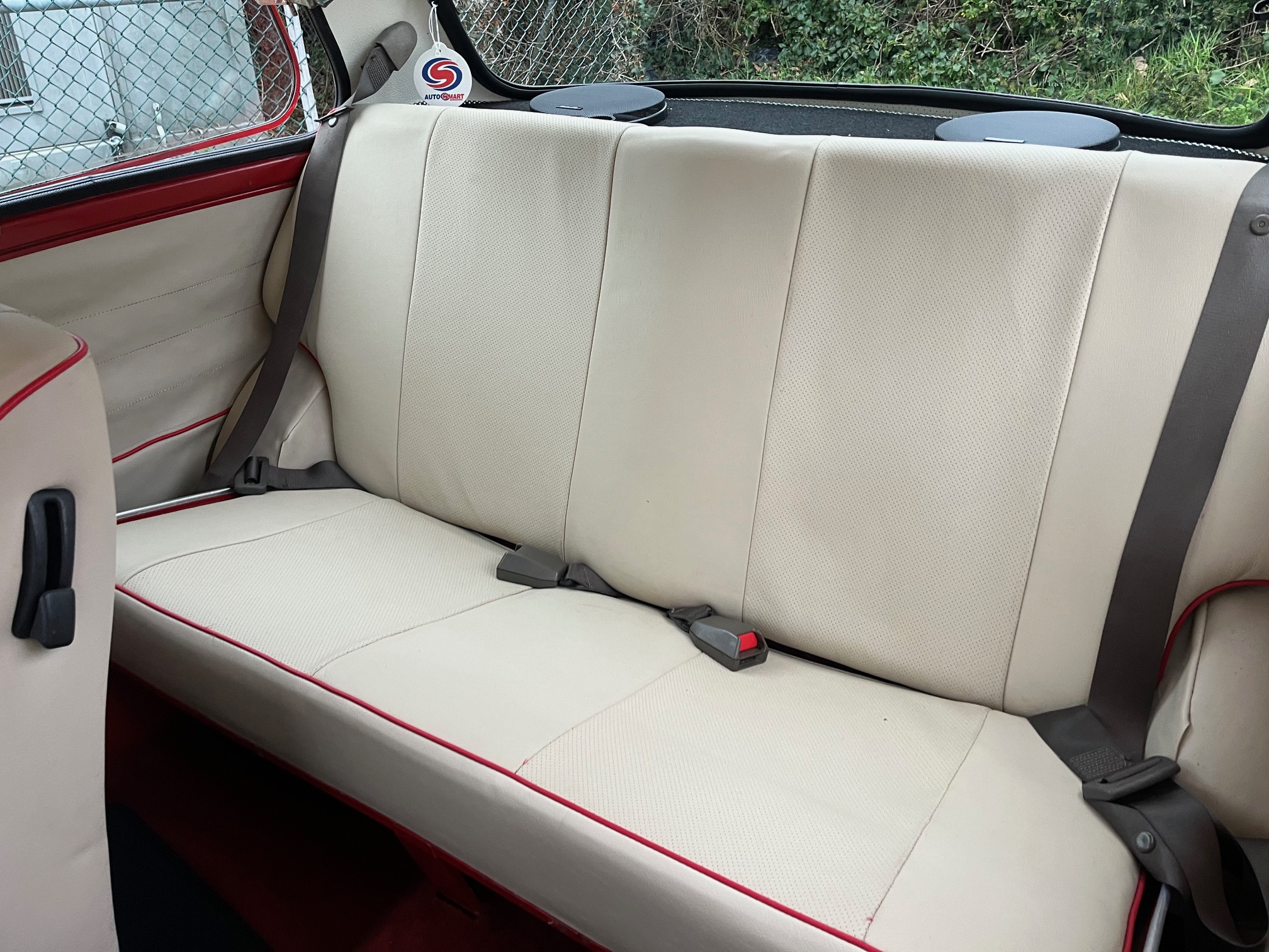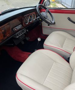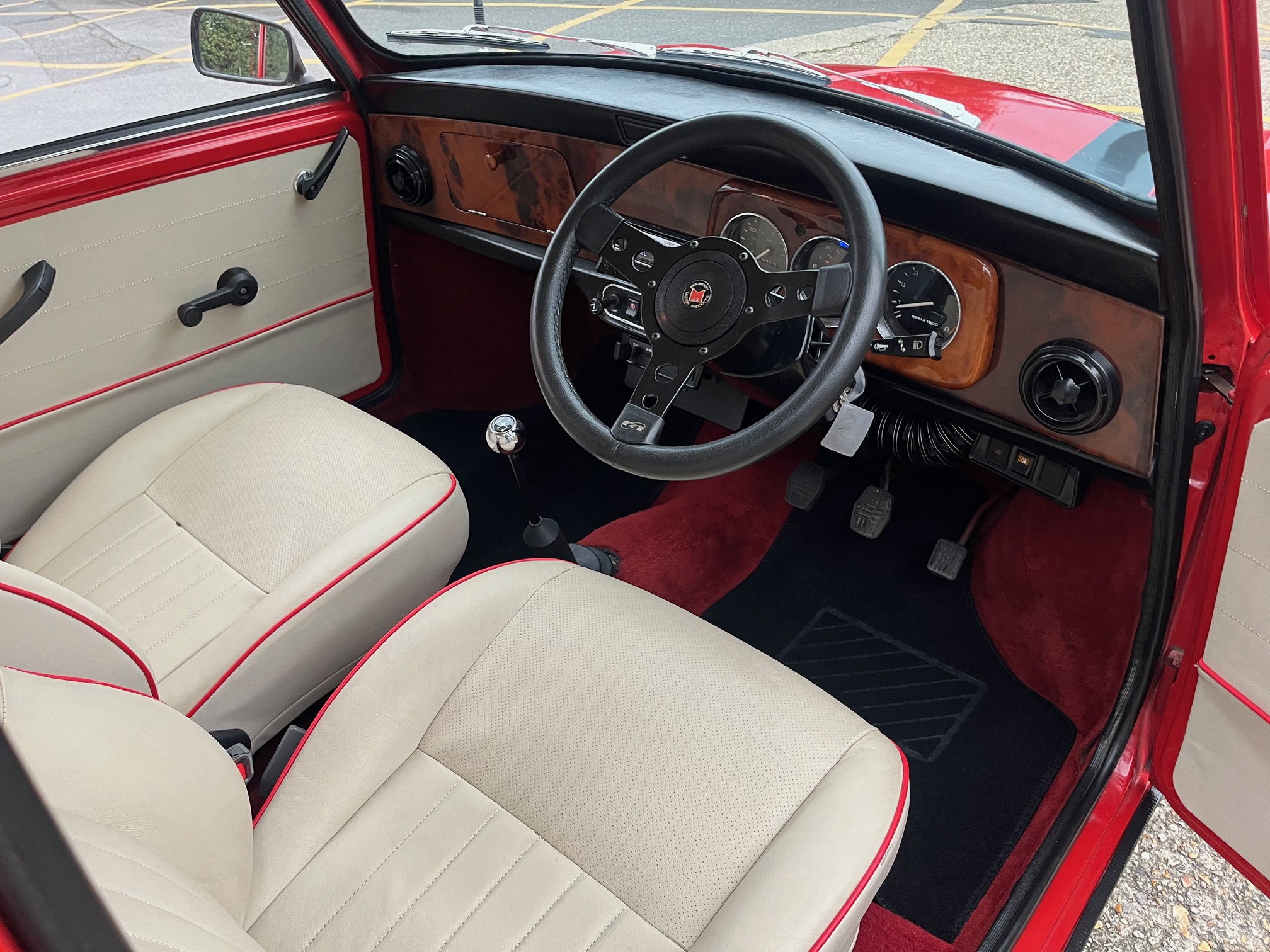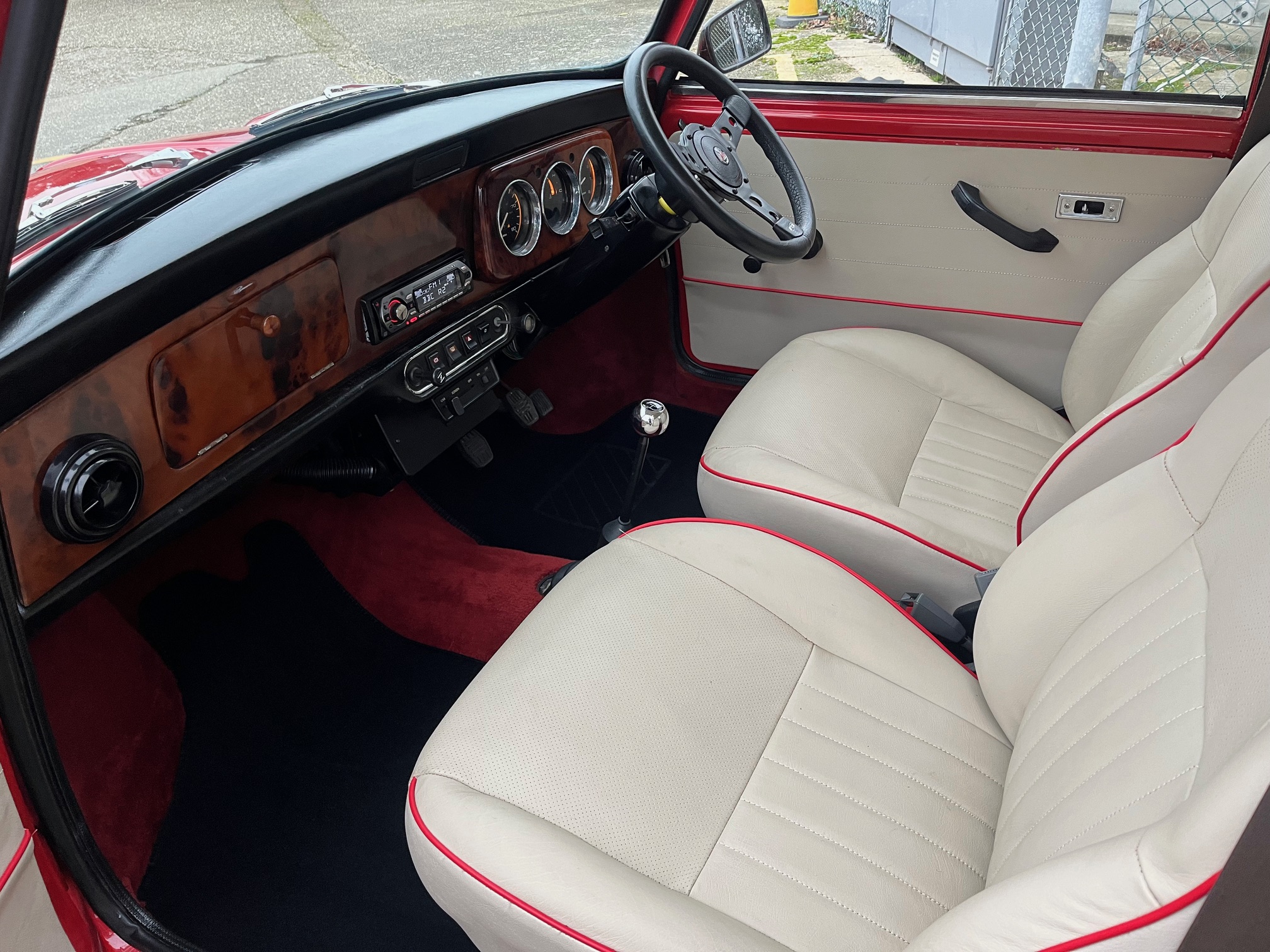 The Mini has a fantastic interior that really sets it apart from the rest. It has wonderful cream seats with red piping with matching door cards. It also has a full length walnut dash with a three clock binnacle that includes a rev counter. Further upgrades include a Mountney Sports steering wheel and a Sony CD player. This model also has rear seat belts.