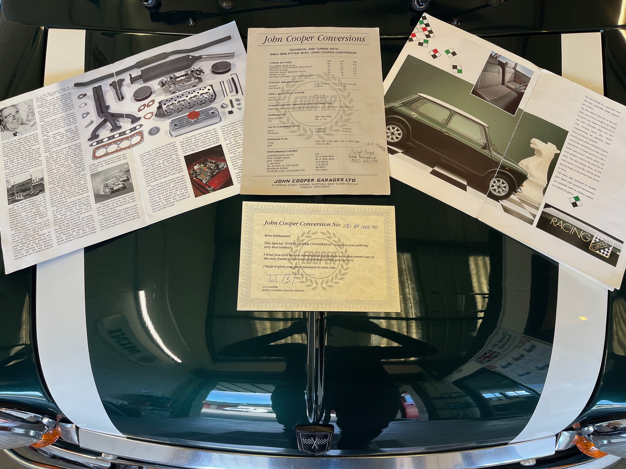 We are very pleased and excited to offer a real piece of Classic Mini history. In 1989 John Cooper Garages decided to take the bull by the horns and started to produce in house tuning kits for the Mini. It had been nearly twenty years since Mini Cooper production had ceased and the public were left wanting speed and excitement. Brand new Limited Edition Minis were converted under license from Rover and given the “John Cooper Conversion” Turning the humble 998 Mini into a fast road drivers machine which paved the way for the relaunch of the Mini Cooper the following year. Only a handful of these special Minis survive, I have only ever prepared one other and I am pleased top say that they still offer plenty of excitement, power, sound and fun, which is what we all need more of. Registered new Mann Egerton in Norwich, this Racing Green edition has only had three previous owners in 35 years and has only covered 77k. It is accompanied with all of its original Handbooks, service book, original dealer registration plates, Racing Green brochure and John Cooper Garages conversion Data sheet, brochure and the all important conversion certificate. It also has a large history folder stretching back to the early nineties.