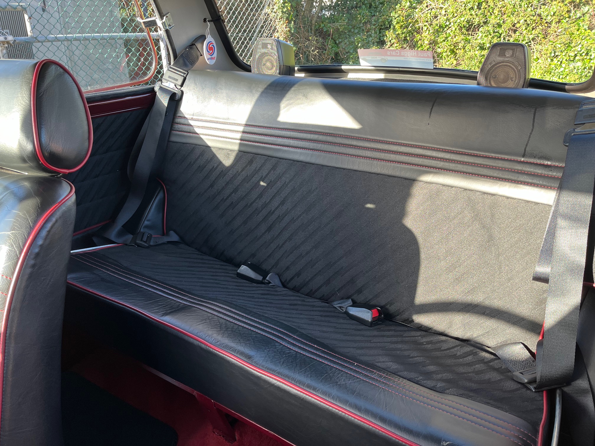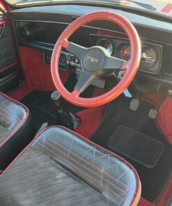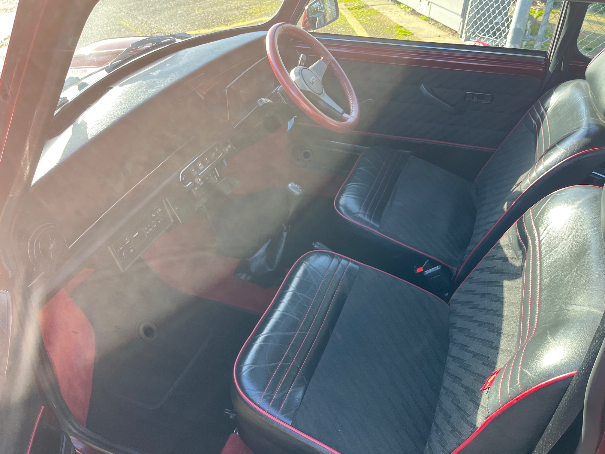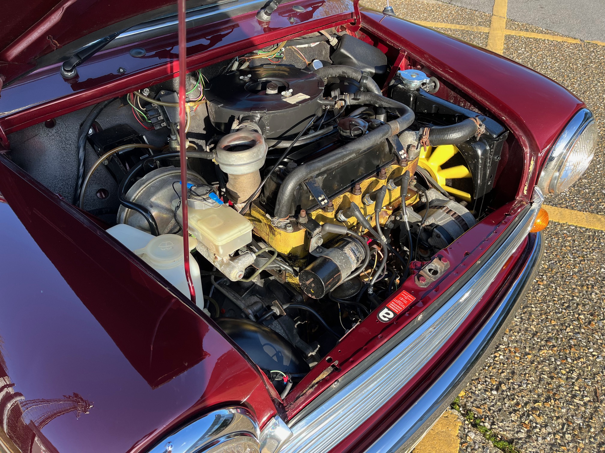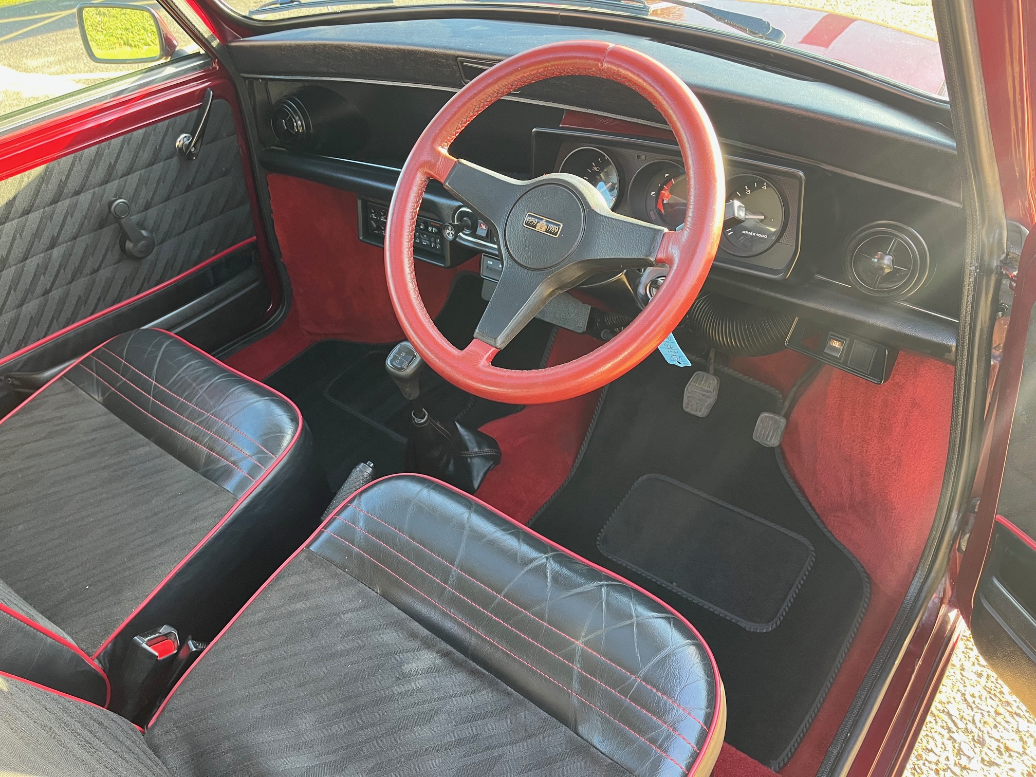 The interior is in excellent condition and completely original and again thanks to its very low mileage it still feels like new. It has the Mini 30 badged half leather seats, three clock dash with rev counter. Red leather steering wheel with matching carpets, the original Philips cassette player and the correct shelf mounted speakers. This model also has rear seat belts.