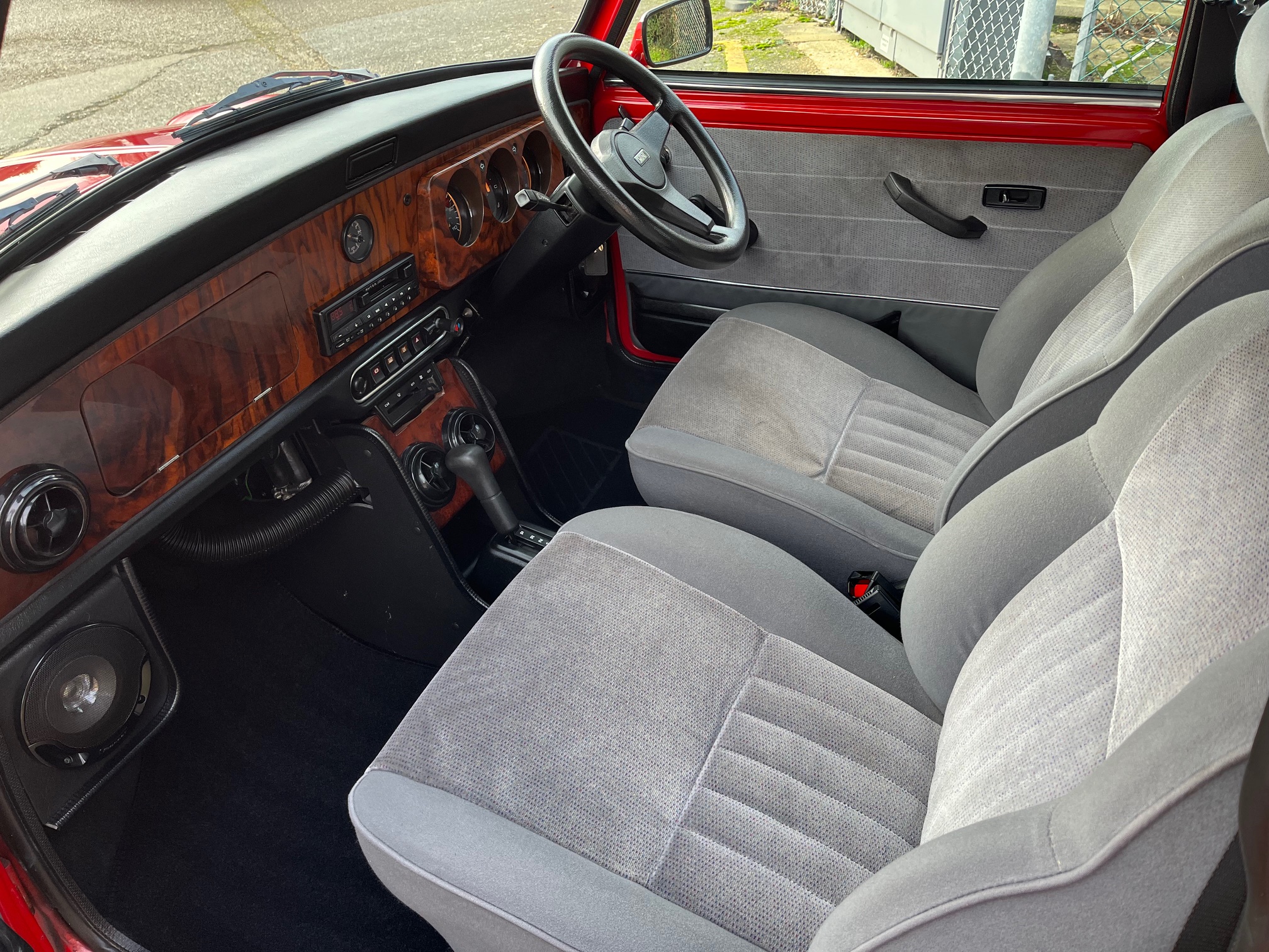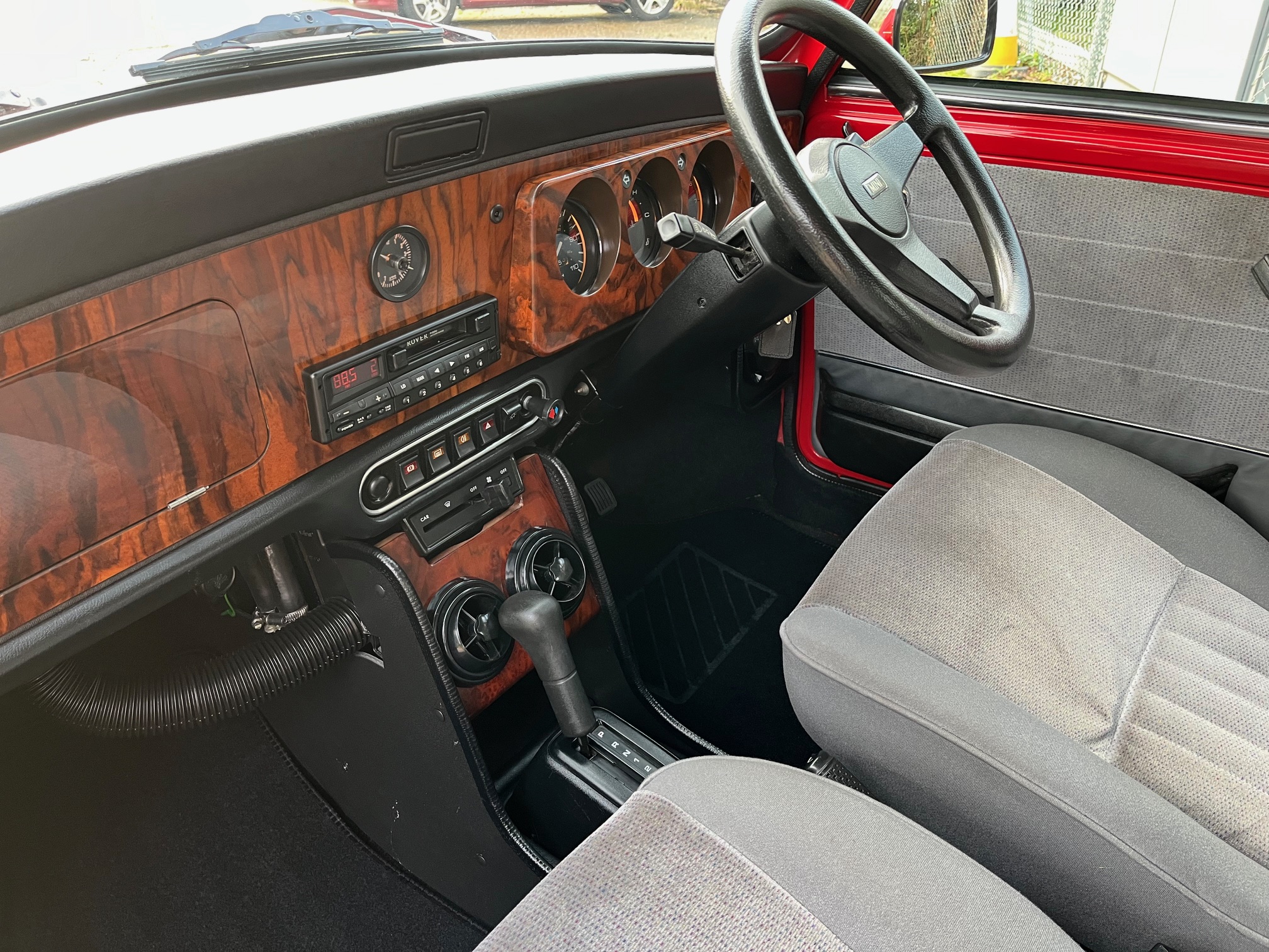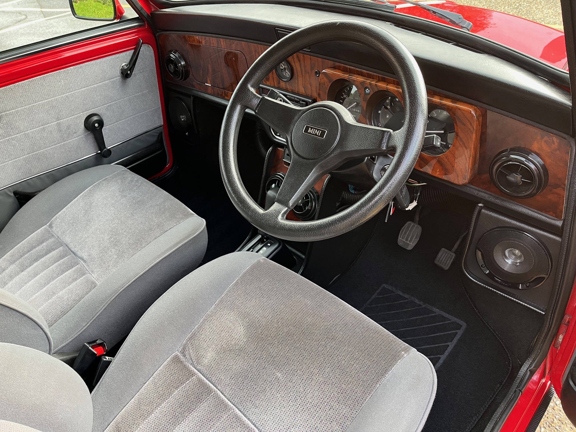 The interior is very well presented and has the look and feel of a low mileage Mini. The full Mayfair spec is on offer here with a full length Walnut dash, rev counter, analogue clock, original Rover cassette player and the addition of a matching centre console, extra speakers and a 12v adapter for charging devices. This model also has rear seat belts.