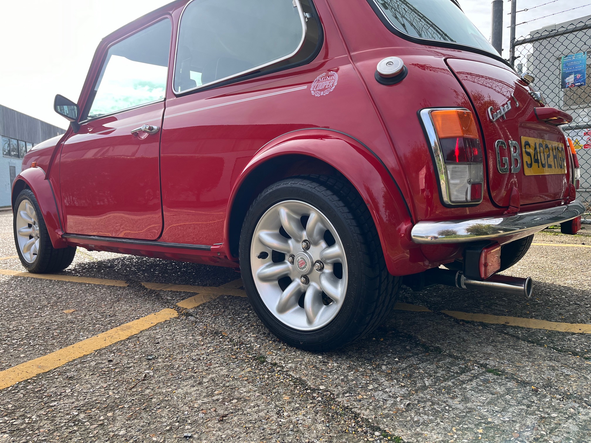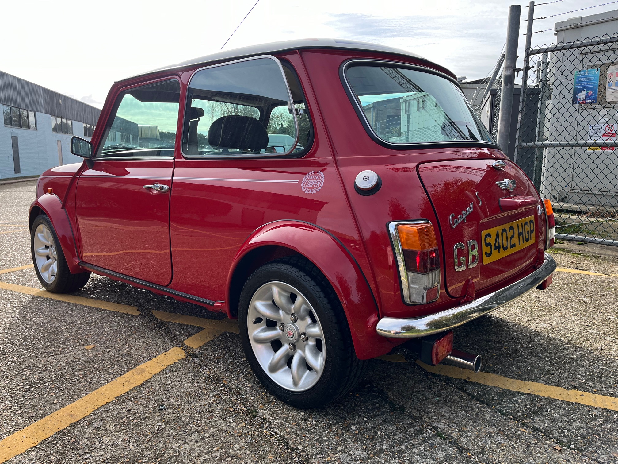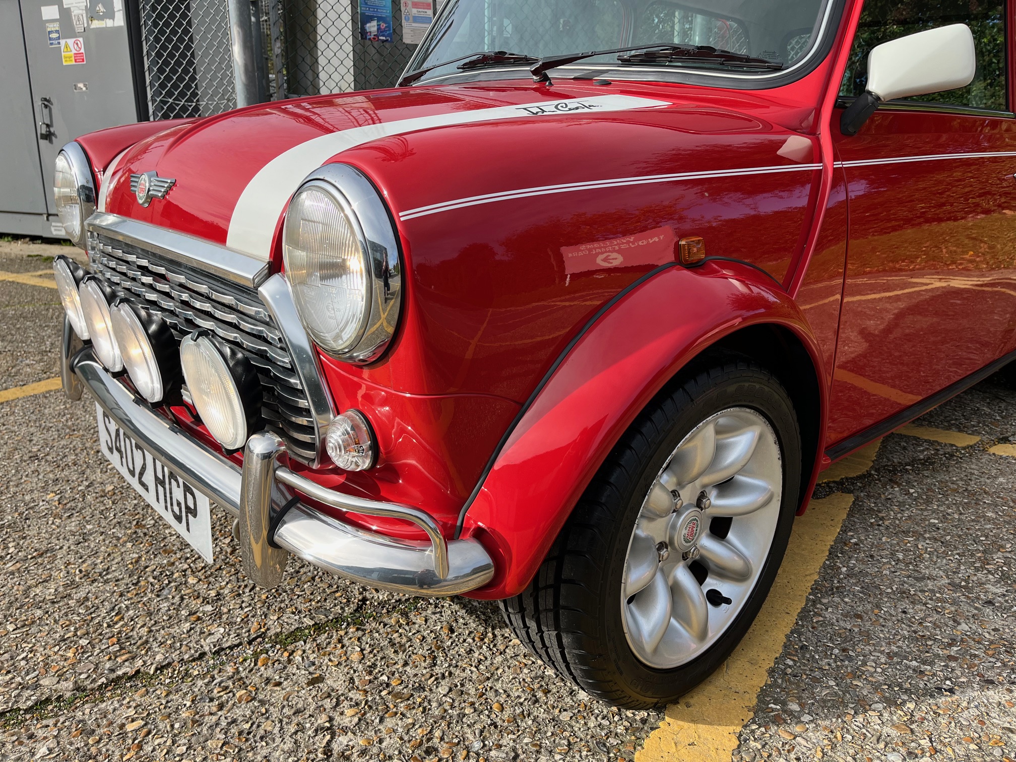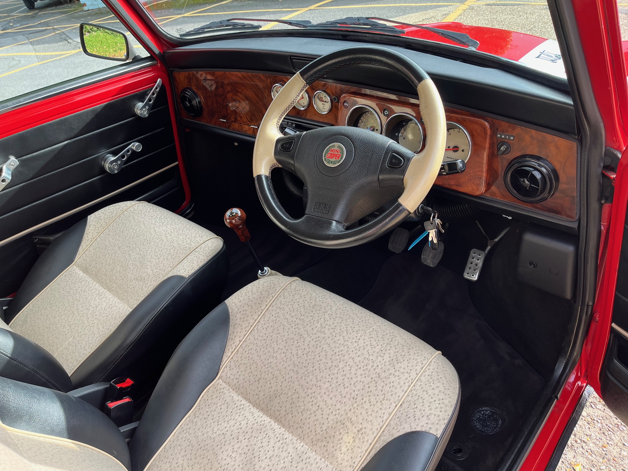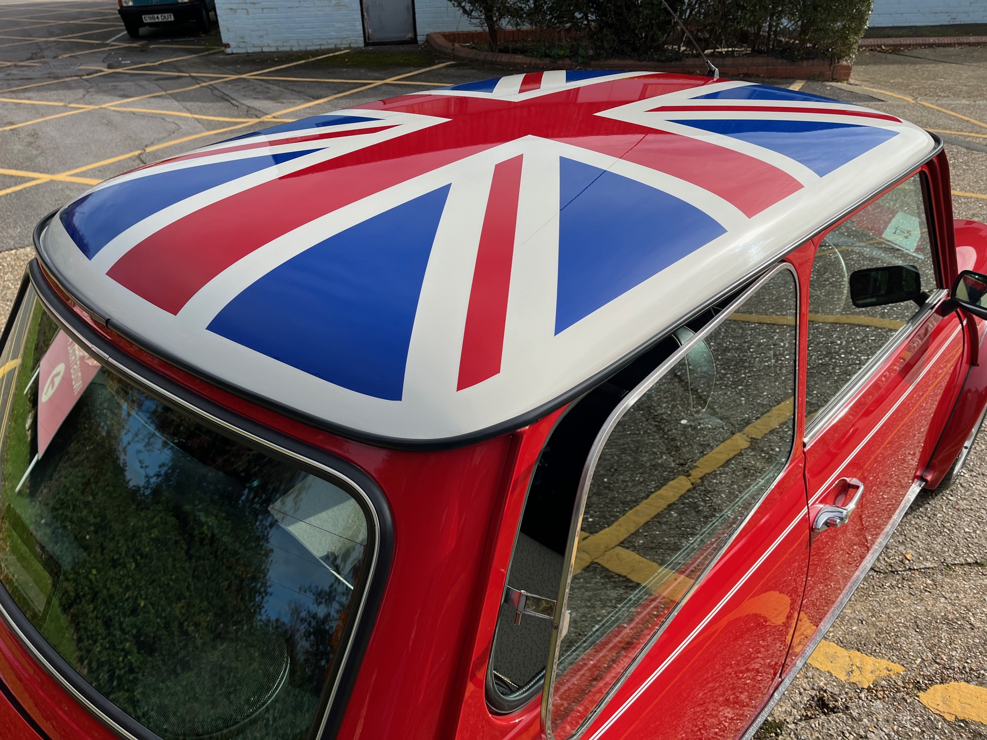 We are very pleased to offer a beautiful 1999 Rover Mini Cooper Sportspack. Finished in Solar Red with a contrasting Union Jack roof. This is a very are find as it has only had one owner since it was one year old and covering just 24k in 26 years. It is even more remarkable in that it is presented with all of its original paint and panels. It has spent its life on light duties and always garaged, it has been an absolute pleasure to prepare and drive. It is accompanied with its original handbook, service book and both sets of keys and fobs. It has all of its original showroom options that were available in the brochure at the time which include the Morris style wavy grille, Union Jack roof, third level brake light, alloy rocker cover, alloy door furniture, walnut gear knob and the extra boot badges. It is a total time warp and high quality example.