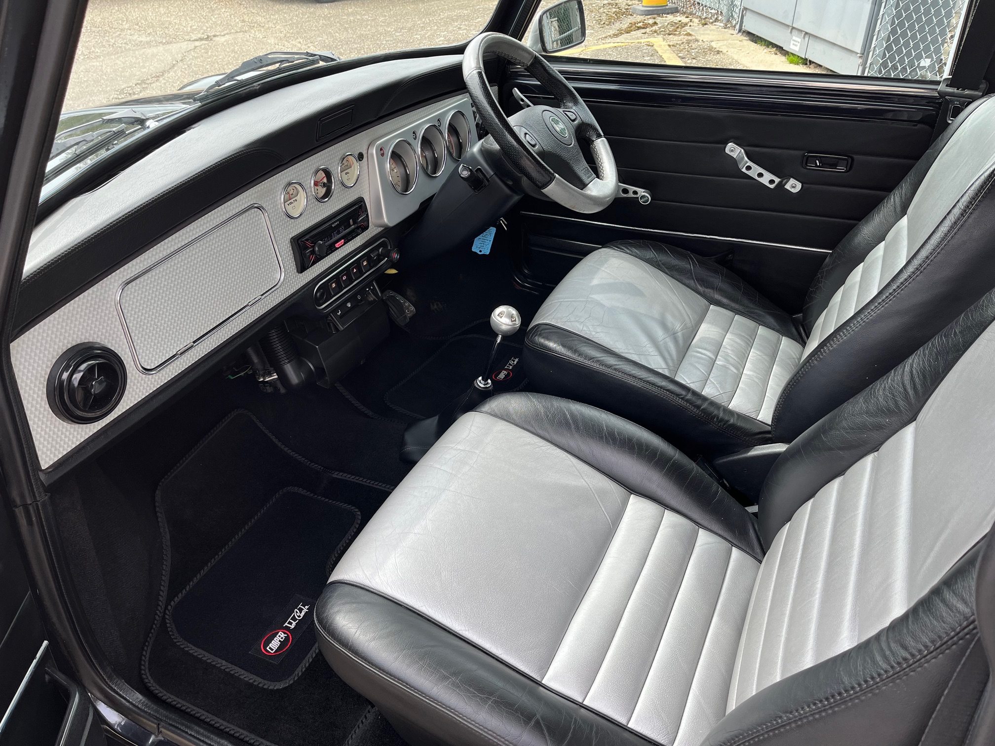 This Cooper has a wonderful interior with its correct half leather trim with Platinum Silver inserts, full length Aluminium turned dash with 6 magnolia dials, aluminium door furniture and an uprated Sony stereo with AUX and USB. This model also has rear seat belts.